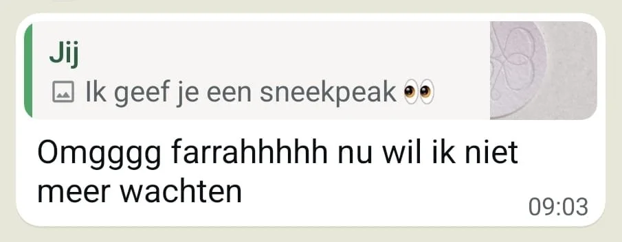 “Wat ben jij een geweldige vrouw om mee samen te werken! Zo veel passie en kunde voor het ontwerpen. Ik ben zo blij met jou! Jij hebt zoiets moois gecreëerd. Ik ga jou echt aan iedereen aanraden die ook maar iets met een (re)branding wilt. Op nog veel meer mooie samenwerkingen lieverd 😊”